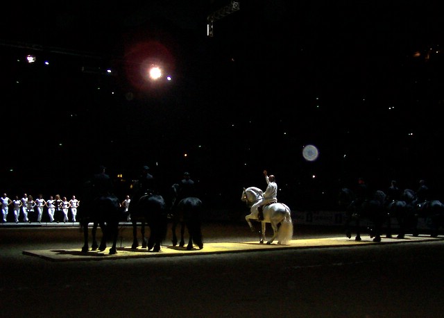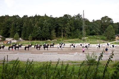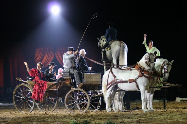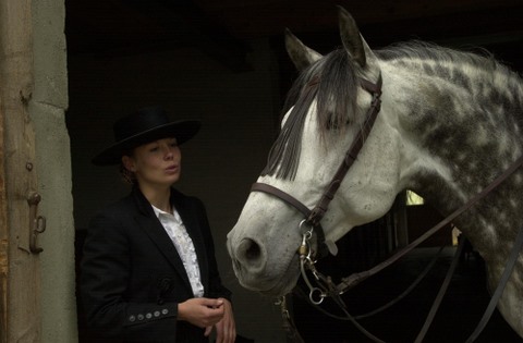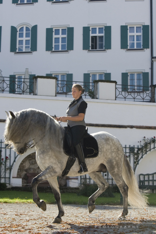 Jede Stute wird unter dem Reiter ausgebildet und meist auch im Gespann. Natürlich verläuft eine solche Ausbildung wegen der Belastung durch den Zuchteinsatz deutlich langsamer und unregelmäßiger als die der Hengste, aber es gibt immer wieder Exemplare, die es bis in die Hohe Schule schaffen. Eine besonders eindrucksvolle Demonstration dieser Besonderheit unseres Gestütes war die große Zuchtstutenquadrille, die unsere Reiterinnen auf dem "Iberischen Tag" in München 2003 vorstellten (Bild oben).