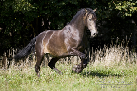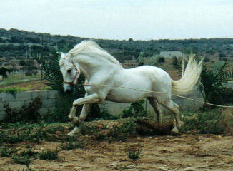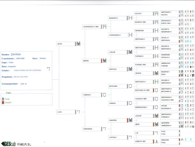 PURA RAZA ESPANOLA DE LA ESTIRPE CARTUJANADie Mutterlinie unserer PRE-Stuten basiert weitgehend auf den beiden Halbschwestern ZAHINA und BEAR aus der Zucht des Xavier Garcia Romero, eine der ältesten Karthäuserzuchten überhaupt, deren Ursprünge bis ins 18. Jahrhundert zurück belegbar sind. Sie tragen als Brandzeichen eine Sieben, weswegen das Gestüt auch weithin als Yeguada del siete (Sieben) bekannt ist. Xavier war mit Alvaro Domeq zusammen Gründer der Real Escuela in Jerez und deren theoretischer Kopf und praktischer Ausbildungsleiter. Leistungsfähigkeit des Pferdes für höchste Dressuranforderung war daher selbstverständliches Selectionskriterium für ihn. Mit äußerster Konsequenz linientreu auf einen einzigen Typus hin durchgezogen bieten diese Pferde neben ihren individuellen Eigenschaften eine genetische Sicherheit und Einheitlichkeit wie man sie sonst selten findet. Kaliber, Kraft, Größe und enormes Temperament gepaart mit Typ und überaus gangstarker Ausdruckskraft des Bewegungsapparates. Es handelt sich um echte Karthäuser im fachlichen (nicht puristischen) Gebrauch des Begriffes. Das heißt, daß die Abstammung rein auf die Pferde der Mönche zurückgeht und jene etwas rustikaleren, meist braunen Stutenstämme unserer Rasse wie etwa Escalera, Marin oder Yeguada Militar genetisch komplett ausgeschlossen sind.